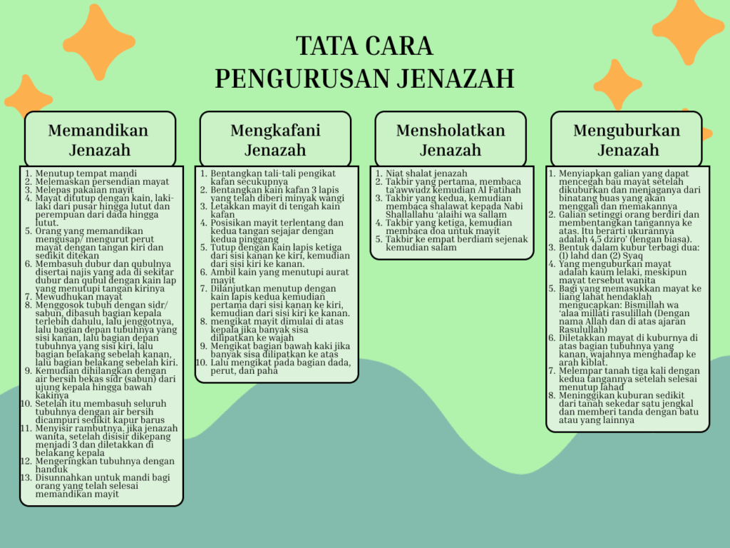 Mind mapping ini membantu memvisualisasikan tahapan-tahapan pengurusan jenazah secara sederhana, runtut, dan mudah dipahami, sehingga dapat dijadikan sarana belajar maupun pengingat dalam praktik kehidupan sehari-hari.